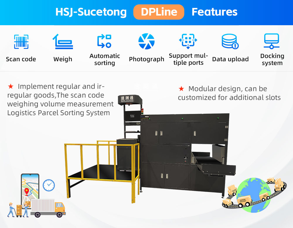 HSJ-Sucetong DPLine automatic barcode scanning, weighing and sorting equipment adopts Haikang machine barcode scanning camera, industrial pressure sensor, stable and reliable data and accurate data, which can realize barcode scanning, weighing, sorting system judgment and sorting of regular and irregular goods. Data upload and other functions, modular design, small footprint, powerful functions, the best assistant for logistics and e-commerce enterprises sorting!