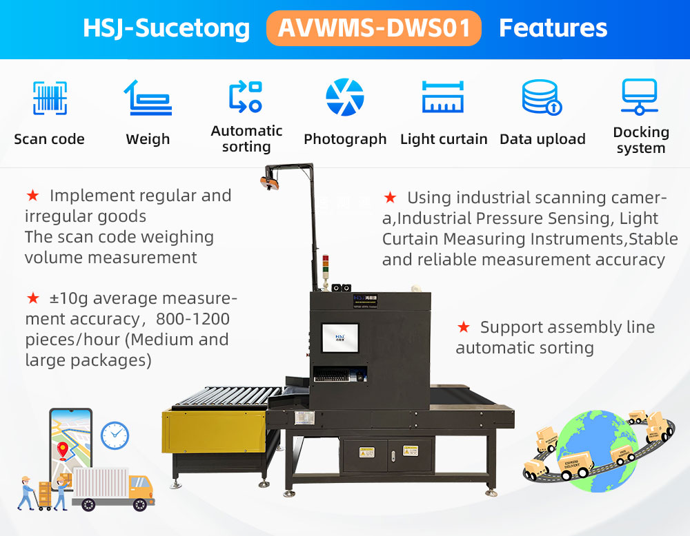 HSJ-Sucetong DWS01 automatic weighing and measuring equipment, using industrial pressure sensing, stable and reliable data accuracy, can realize the functions of barcode scanning, weighing, volume measurement and data uploading of regular and irregular goods, small footprint, powerful functions, The right-hand man for logistics and e-commerce enterprises in and out of the warehouse!